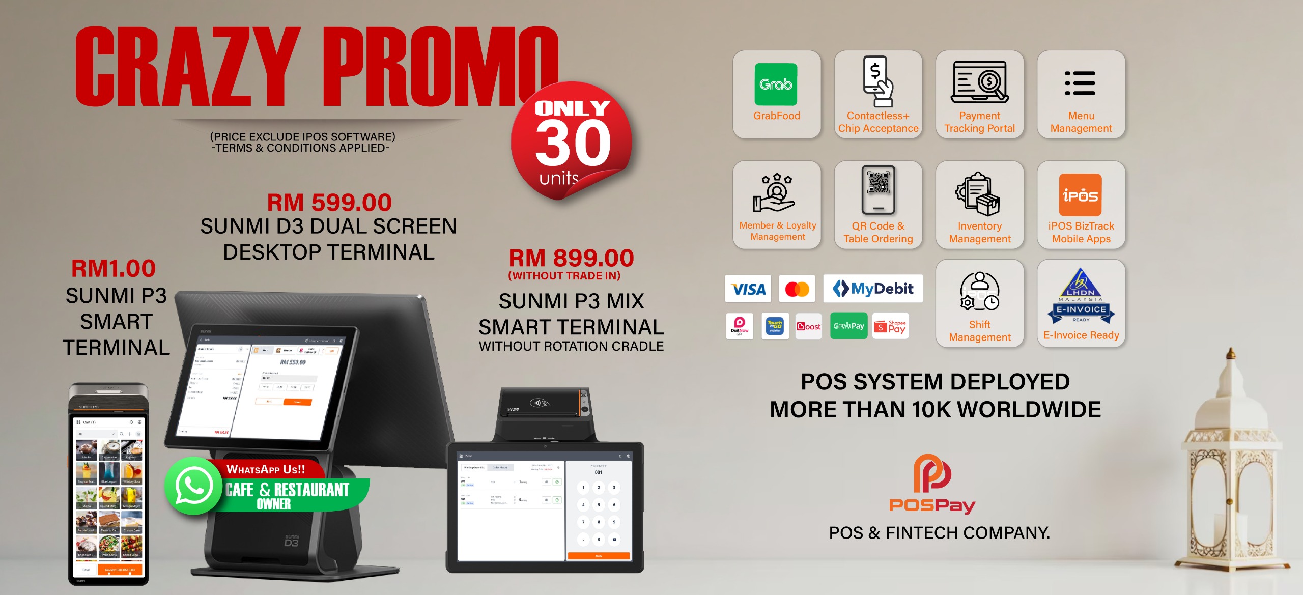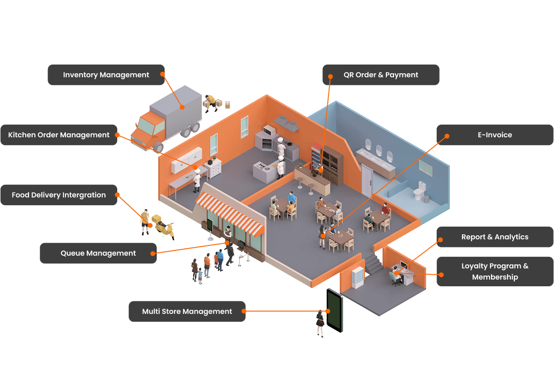 - Customers scan, order and pay directly via QR code (DuitNow, cards, e-wallets) . Reduces wait times and cash handling while cutting staffing needs